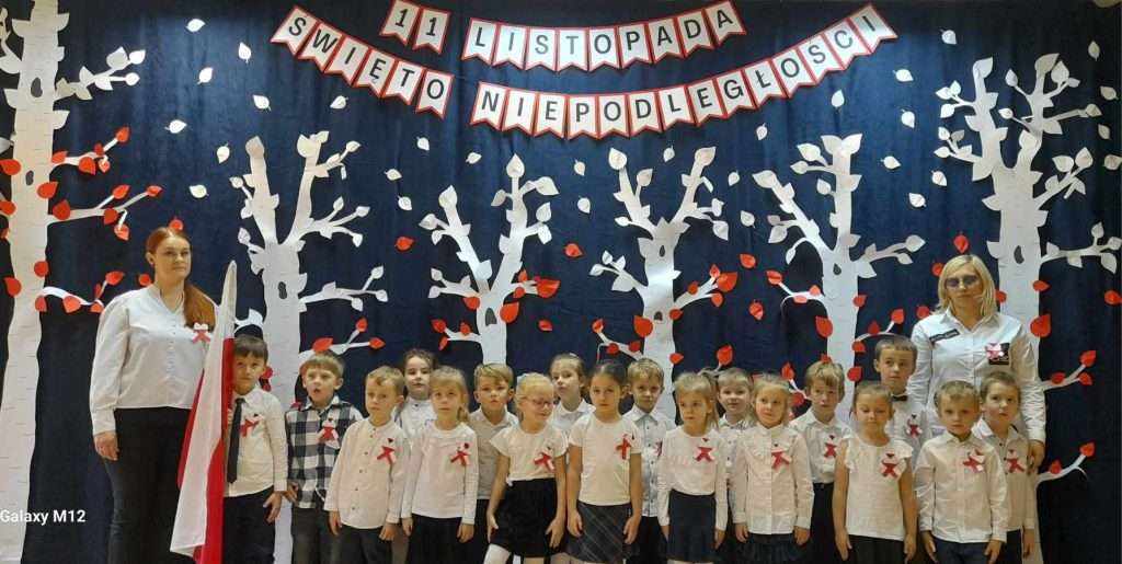 Dnia 8 listopada nasza grupa i całe przedszkole jak co roku wzięło udział w akcji MEiN „Szkoła do hymnu”.  Odśpiewanie hymnu o 11:11 poprzedzone było uroczystą akademią w galowych strojach z kokardami narodowymi na temat odzyskania przez Polskę Niepodległości.