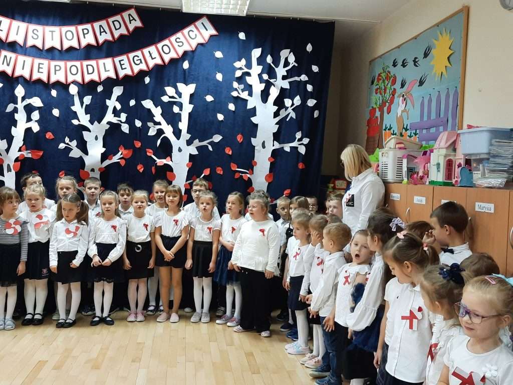 8 listopada w naszym przedszkolu odbyła się uroczysta akademia z okazji Święta Niepodległości. Starszaki z grup Biedronki, Muminki, Czarodzieje i Krasnoludki uczciły ten dzień występując dla młodszych kolegów i koleżanek oraz całej społeczności przedszkolnej. Dzieci z ogromnym zaangażowaniem recytowały piękne wiersze, a ich śpiew rozbrzmiewał w całym przedszkolu wywołując wzruszenie i dumę.