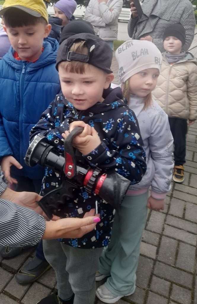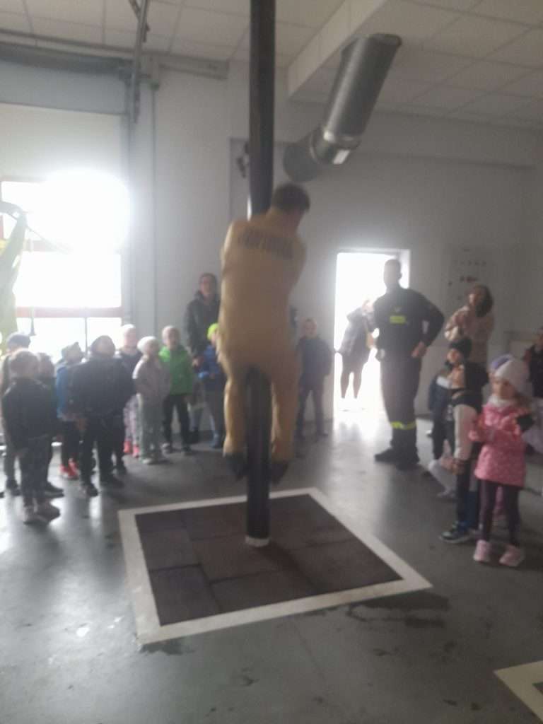 Pan strażak zaprezentował również strój strażacki oraz wyposażenie wozu strażackiego, a także opowiedział o sprzęcie, którego używają podczas akcji ratowniczych. Na zakończenie spotkania przygotował dla dzieci wyjątkowy pokaz – zjazd po strażackiej rurze, który wzbudził w dzieciach ogromne zainteresowanie i podziw.