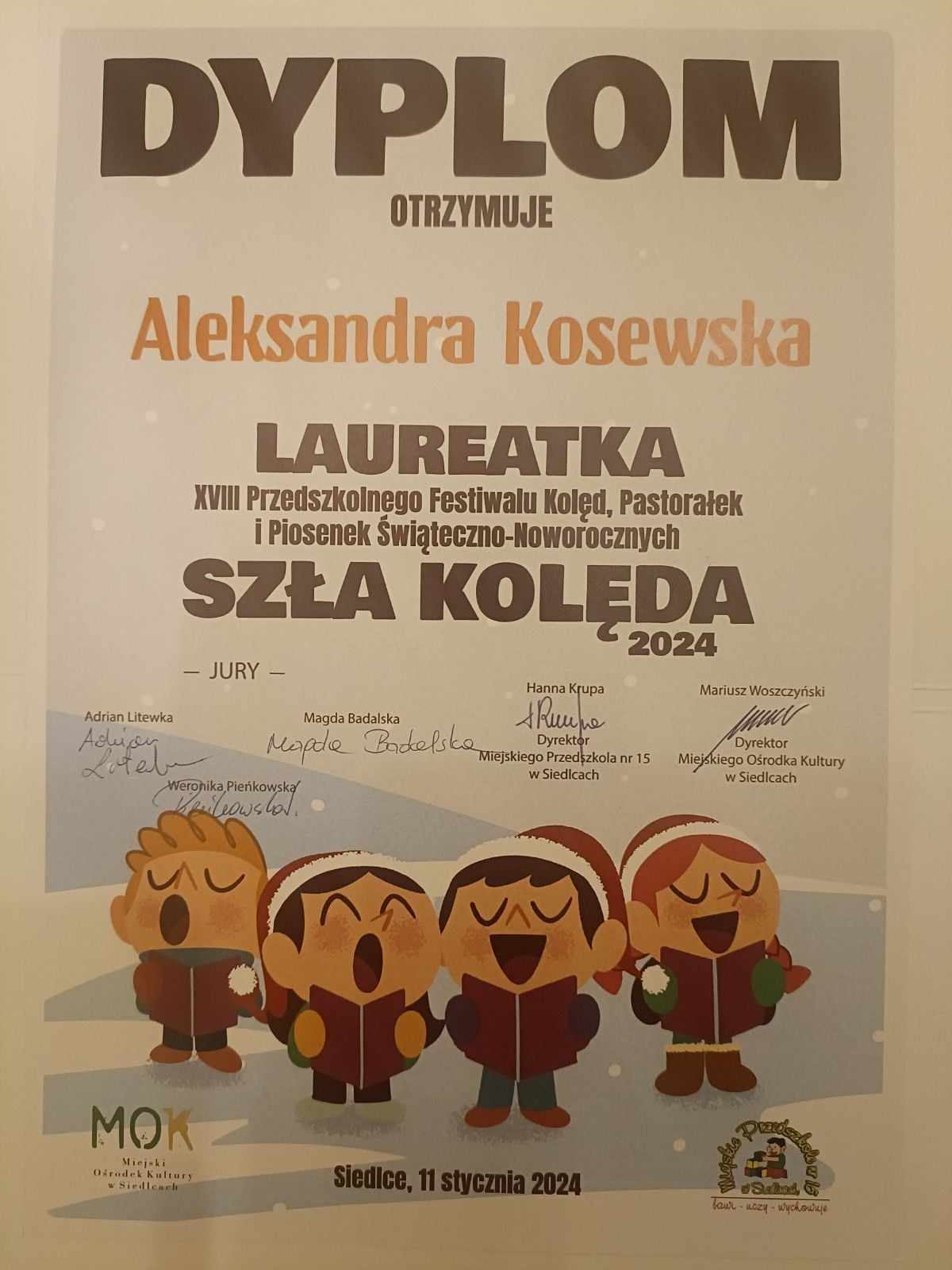 5 stycznia 2024 roku w MOKu w Siedlcach odbył się konkurs w którym wzięła udział Aleksandra Kosewska z grupy Muminki. Ola pięknie zaśpiewała i została laureatką Przedszkolnego Festiwalu Kolęd, Pastorałek i Piosenek Świąteczno-Noworocznych „Szła kolęda”.