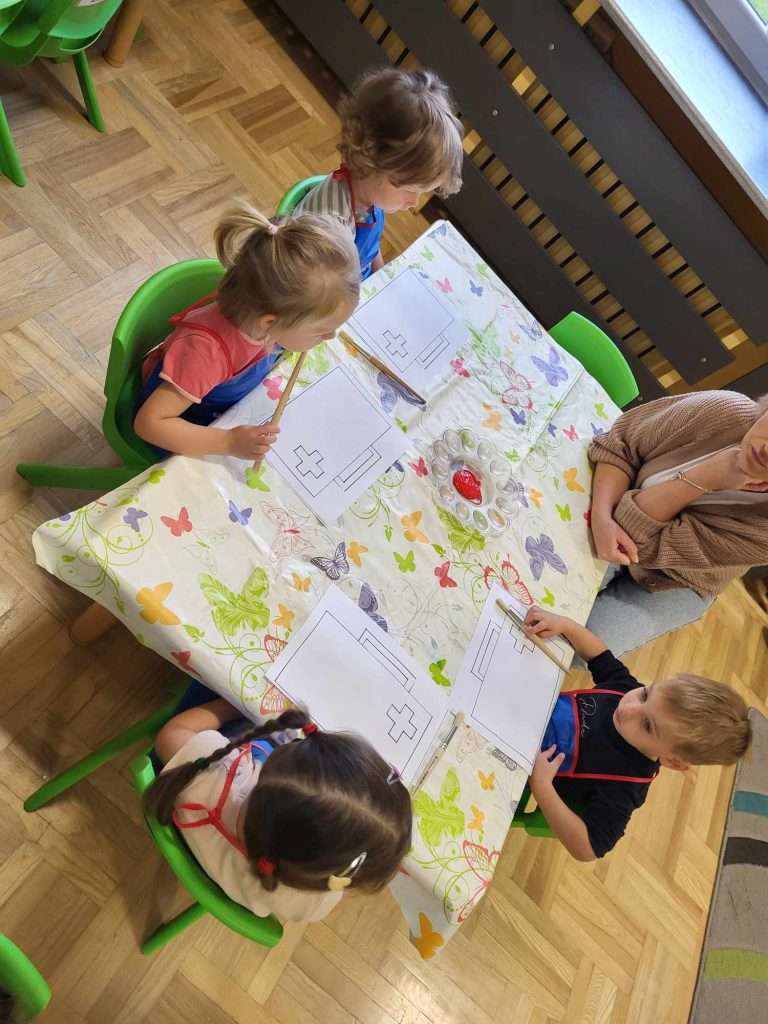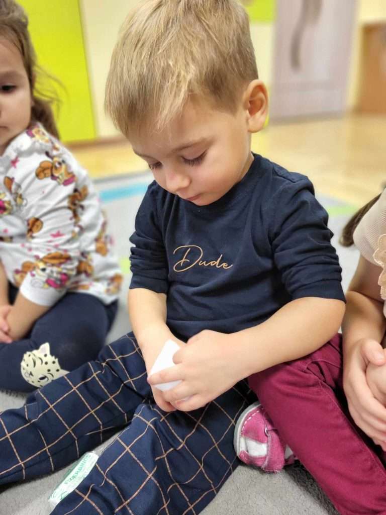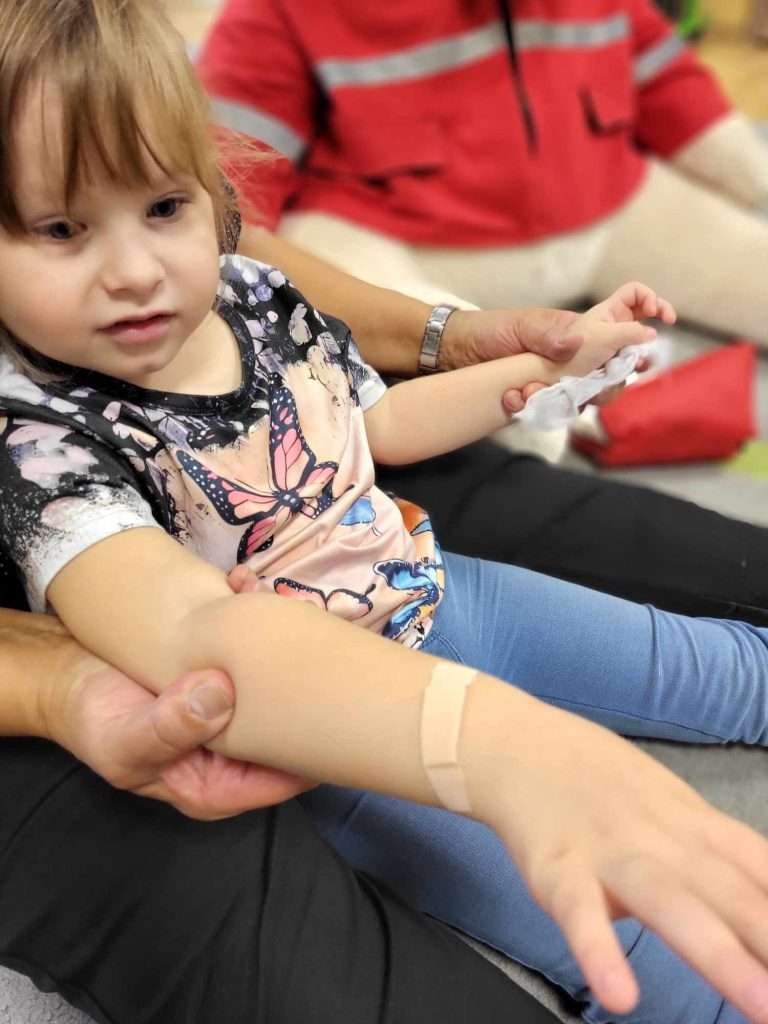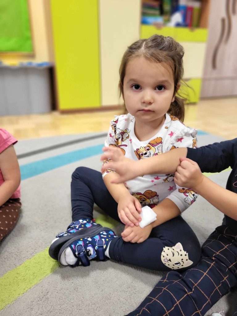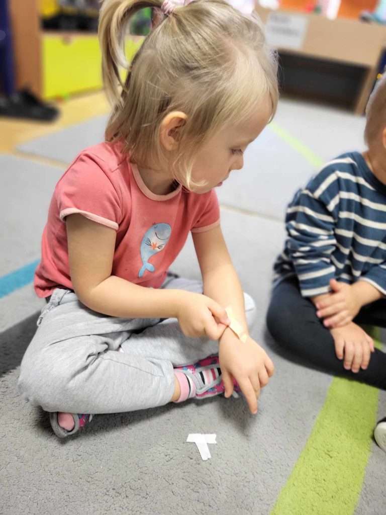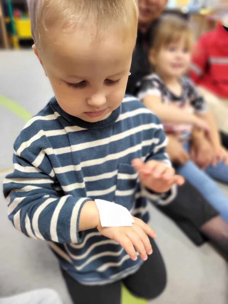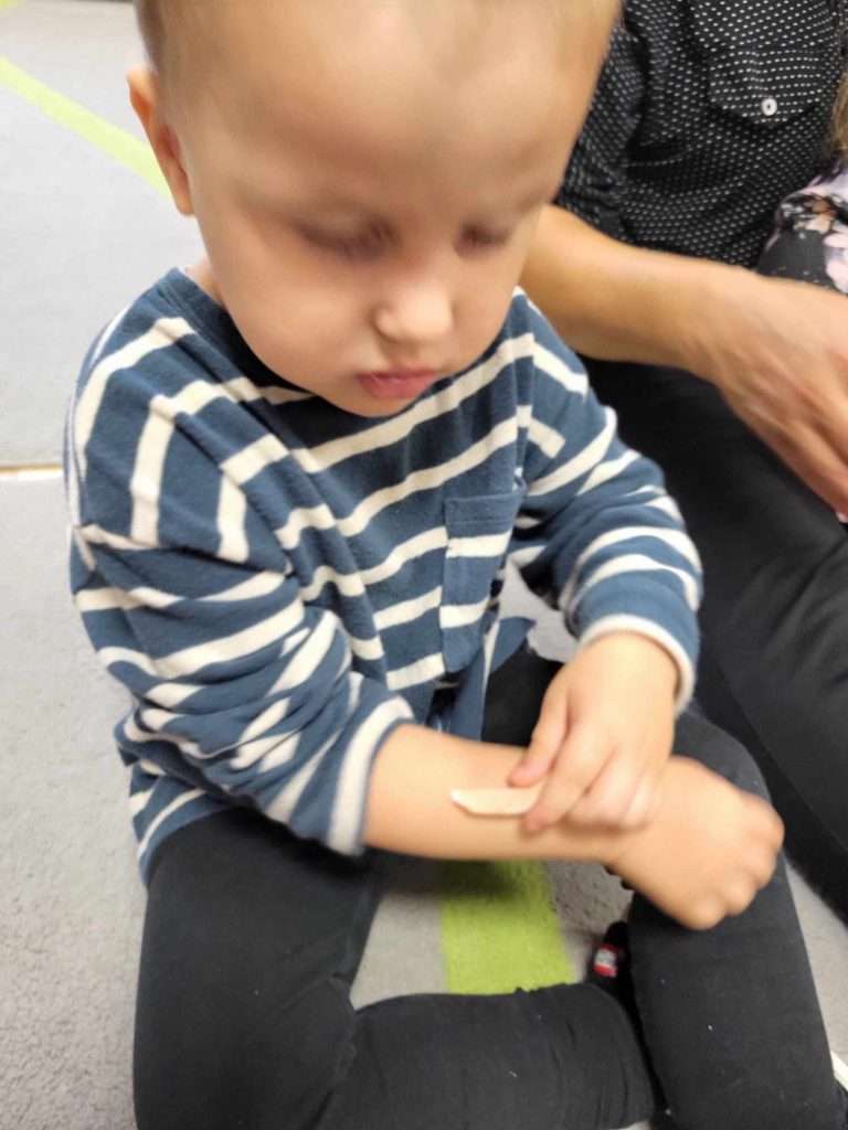 W ramach programu Przedszkolak ratownikiem w listopadzie dzieci zapoznały się z zasadami udzielania pierwszej pomocy w przypadku skaleczenia, zaznajomiły się z zawartością apteczki, a także zapoznały się z numerem alarmowym 112 oraz 999.