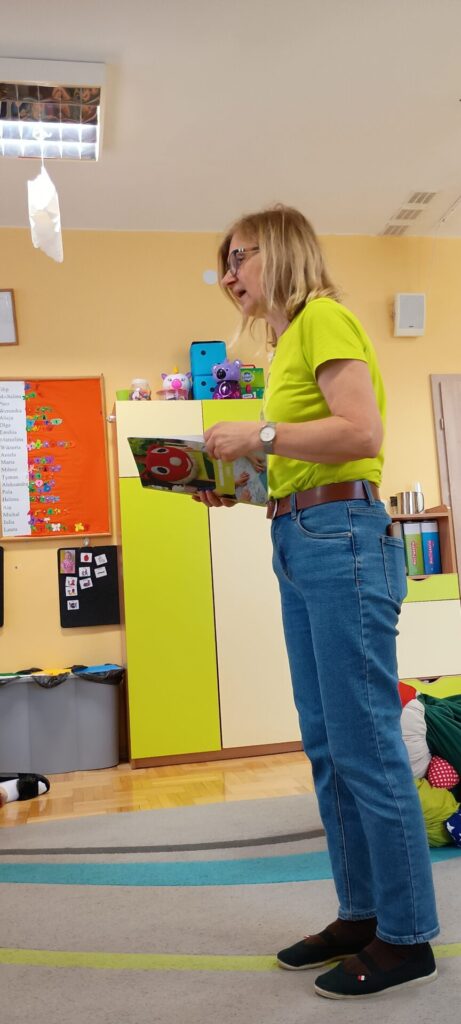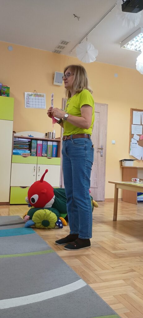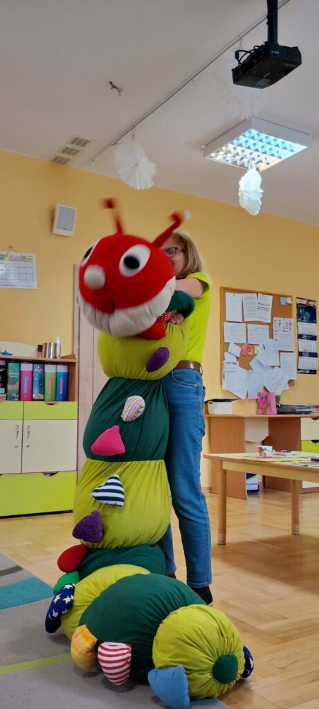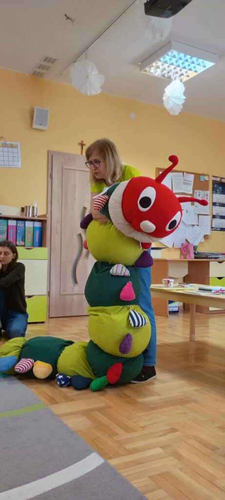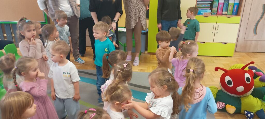 Podczas spotkania dzieci poznały także główną bohaterkę książeczek – gąsienicę Jadzię 🐛, która opowiedziała o tym, jak powstaje książka w drukarni. Dzieci dowiedziały się również, kim są autorzy, ilustratorzy oraz bohaterowie książek.