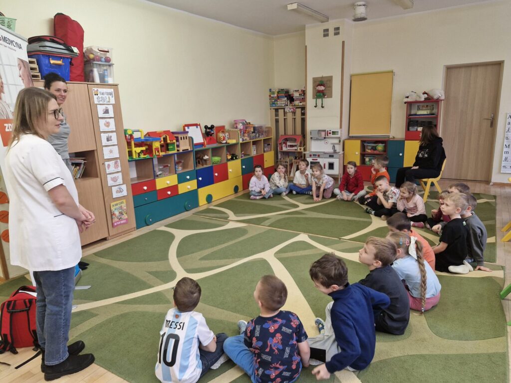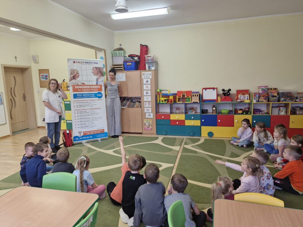 2 grudnia 2025 roku w przedszkolu gościły pielęgniarki z przychodni Salus. Panie w ciekawy sposób opowiadały o swojej pracy oraz przekazały najważniejsze informacje o tym jak dbać o swoje zdrowie.