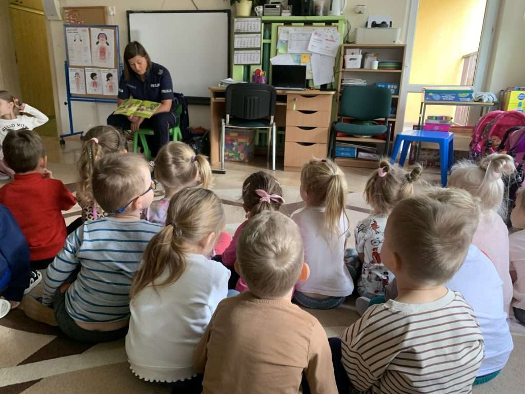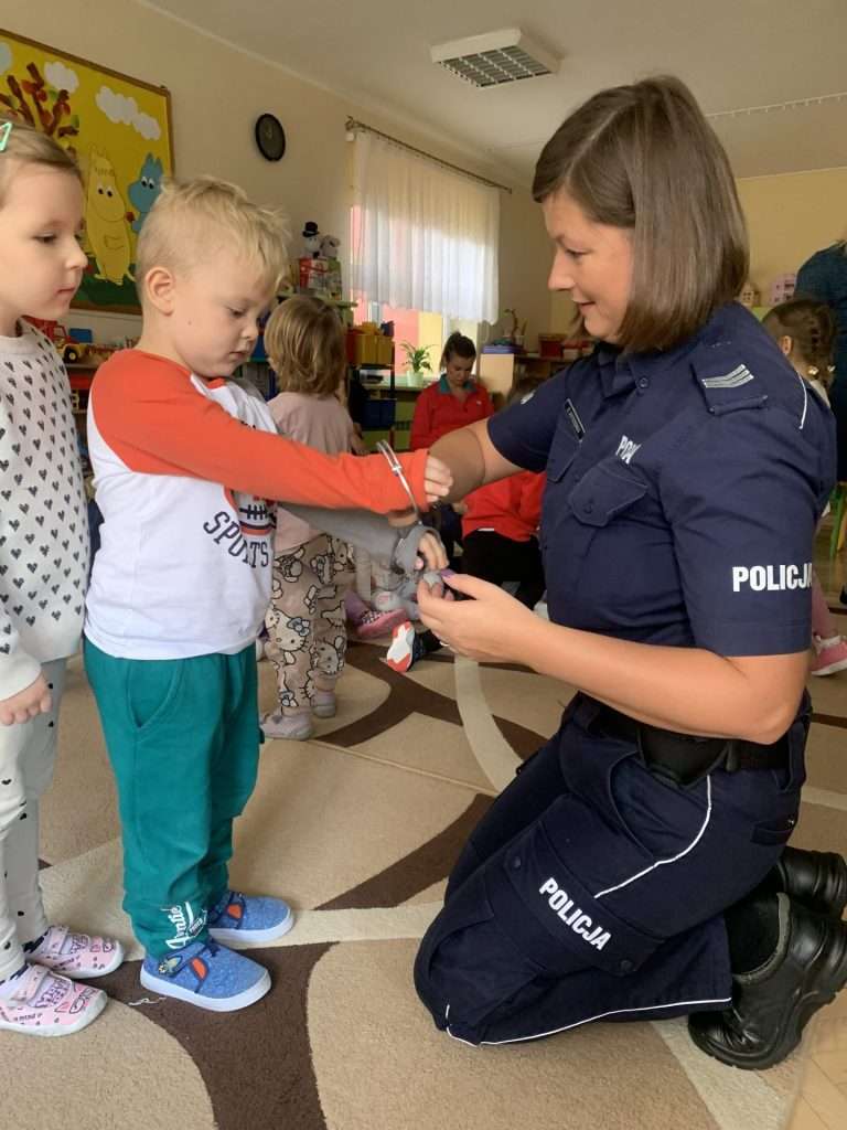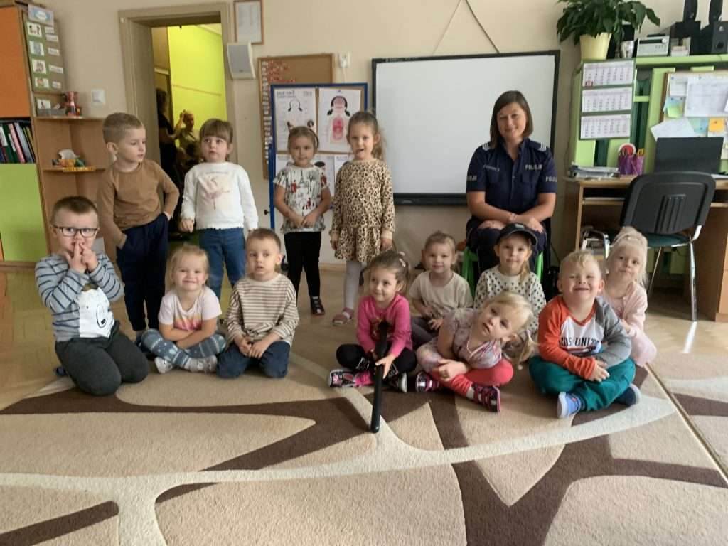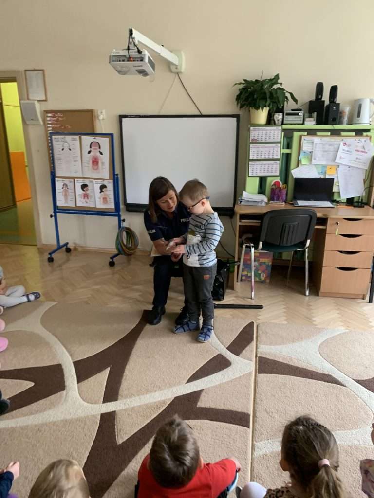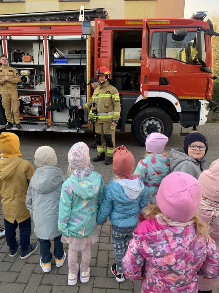 i pani Policjantka. Funkcjonariusze służb mówili dzieciom o swoim zawodzie oraz bezpieczeństwie najmłodszych. Przedszkolaki okazały się bardzo śmiałe i nie bały się zadawać pytań. Pani policjantka przedstawiła wszystkim kilka cennych wskazówek dotyczących bezpiecznego poruszania się po drodze i właściwych zachowań w domu, a także podczas spotkania z nieznanymi zwierzętami. Strażacy natomiast przedstawili i omówili zasady pierwszej pomocy. Wszystkie dzieci miały również okazję obejrzenia z bliska wozu strażackiego oraz zapoznania się z jego wyposażeniem. Była to ważna lekcja bezpieczeństwa, za którą serdecznie dziękujemy.