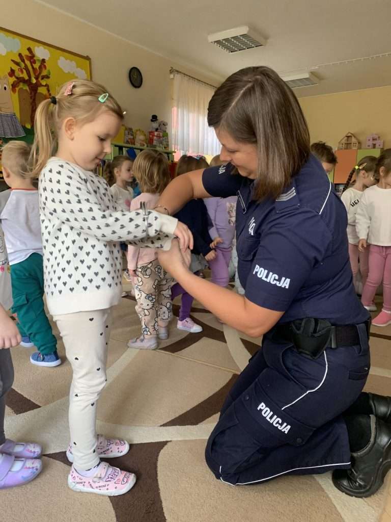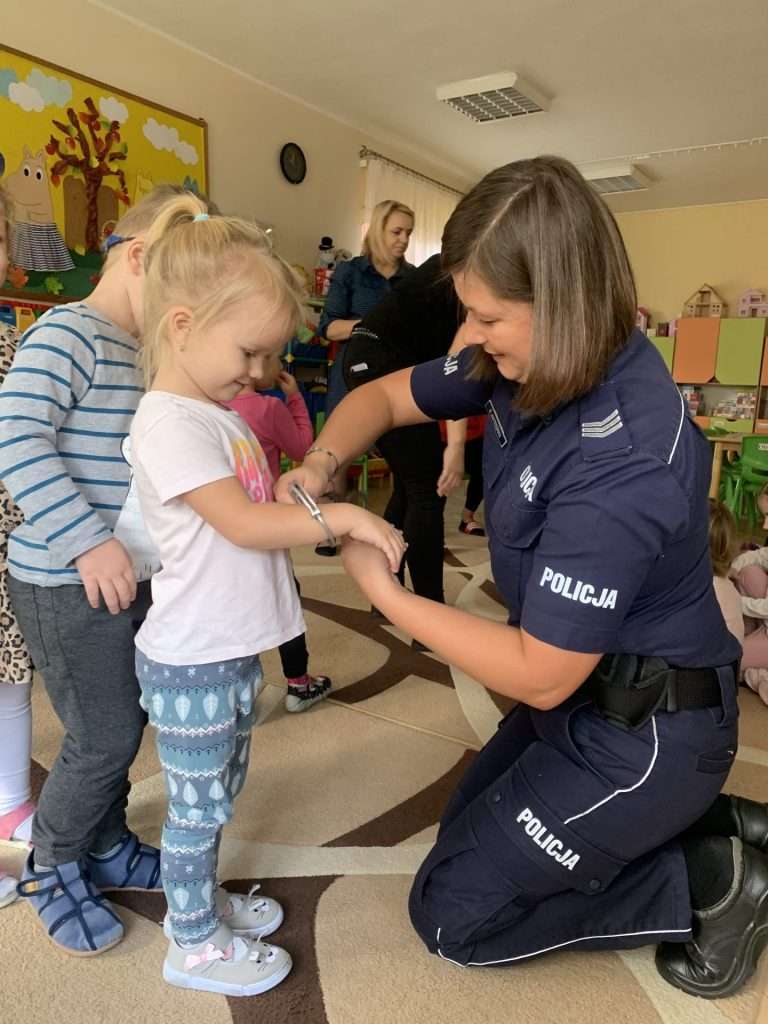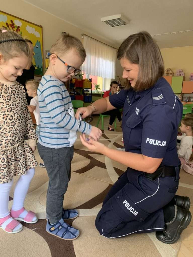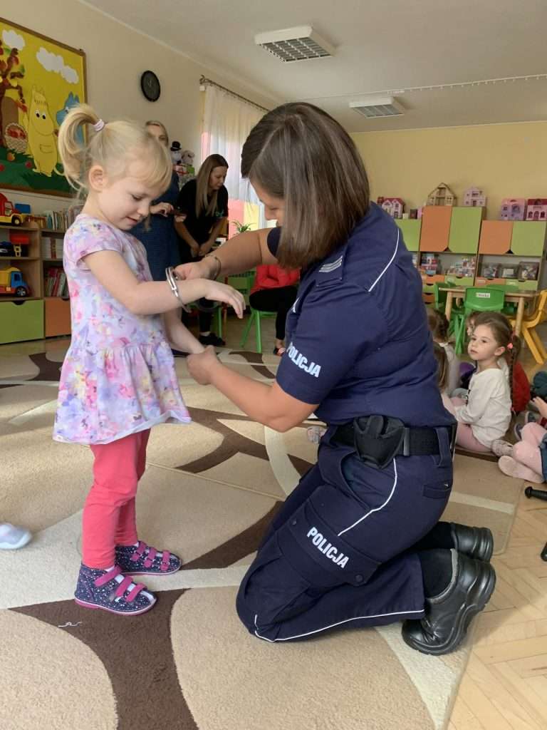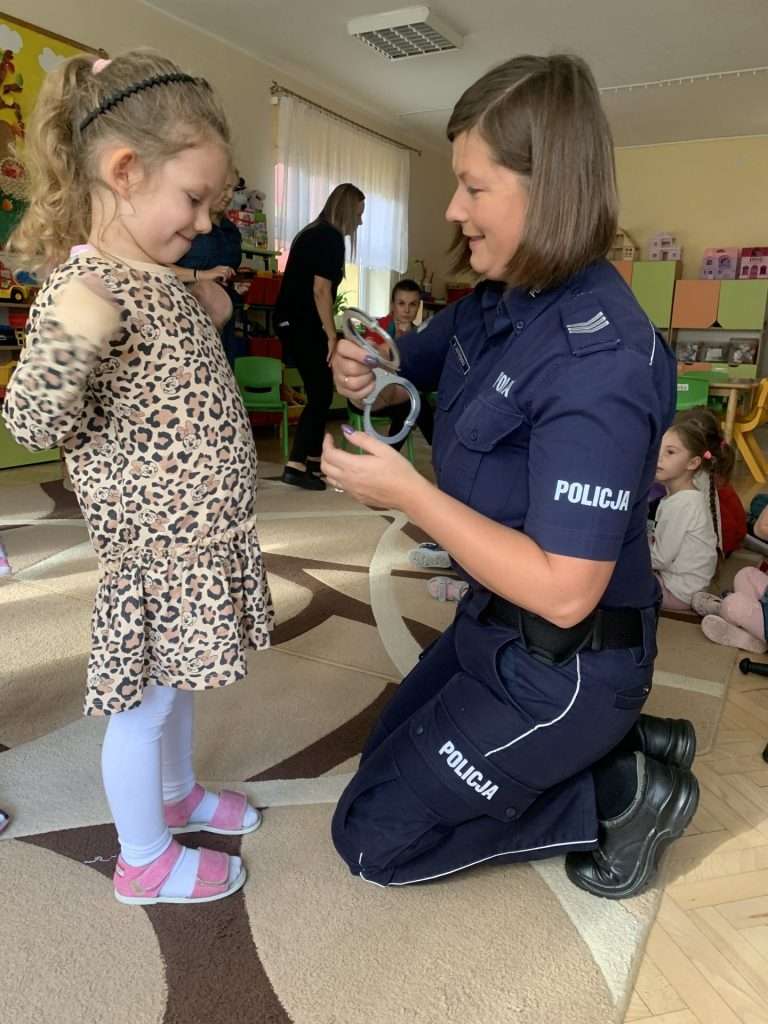 i pani Policjantka. Funkcjonariusze służb mówili dzieciom o swoim zawodzie oraz bezpieczeństwie najmłodszych. Przedszkolaki okazały się bardzo śmiałe i nie bały się zadawać pytań. Pani policjantka przedstawiła wszystkim kilka cennych wskazówek dotyczących bezpiecznego poruszania się po drodze i właściwych zachowań w domu, a także podczas spotkania z nieznanymi zwierzętami. Strażacy natomiast przedstawili i omówili zasady pierwszej pomocy. Wszystkie dzieci miały również okazję obejrzenia z bliska wozu strażackiego oraz zapoznania się z jego wyposażeniem. Była to ważna lekcja bezpieczeństwa, za którą serdecznie dziękujemy.