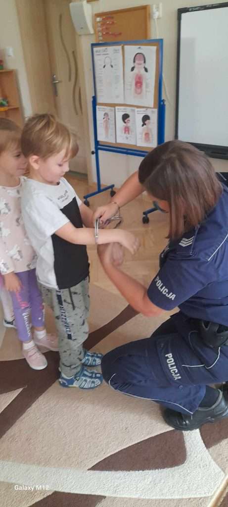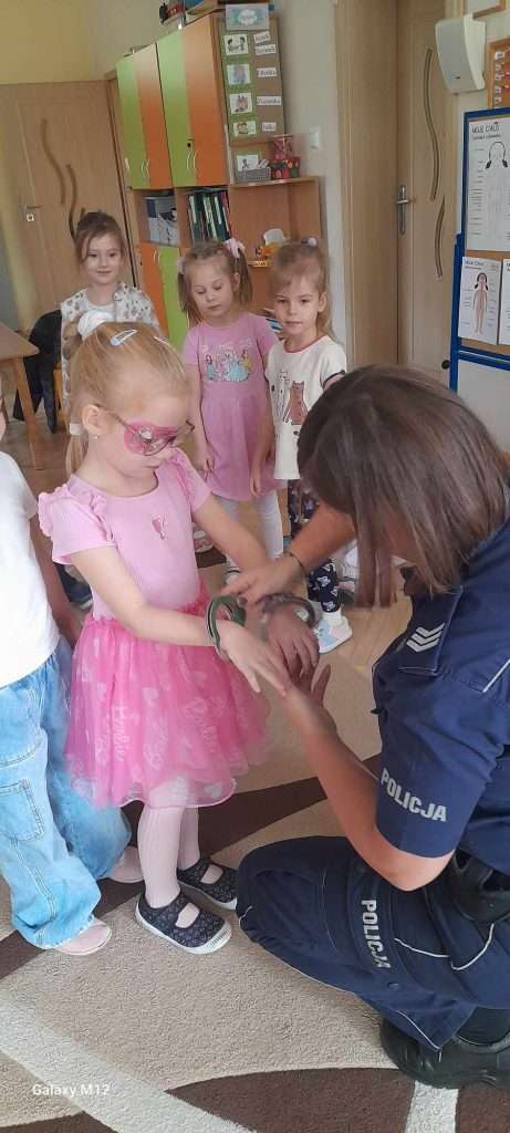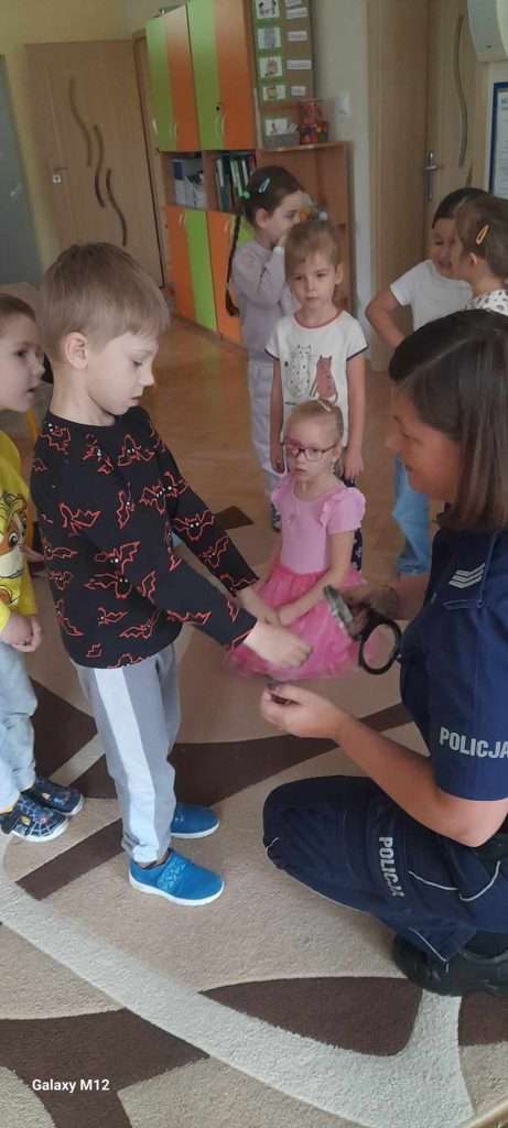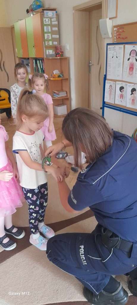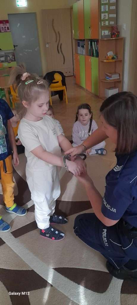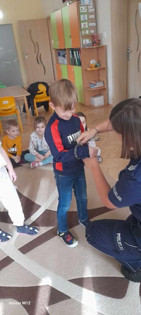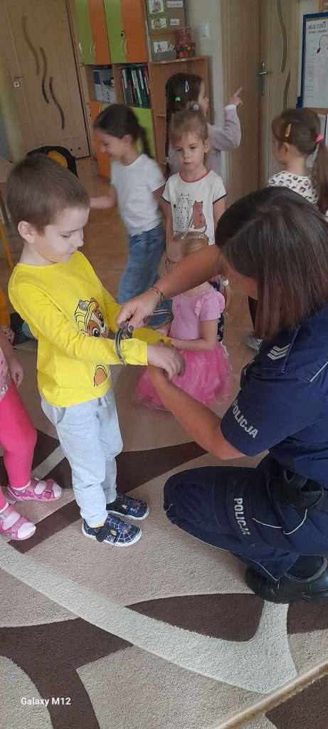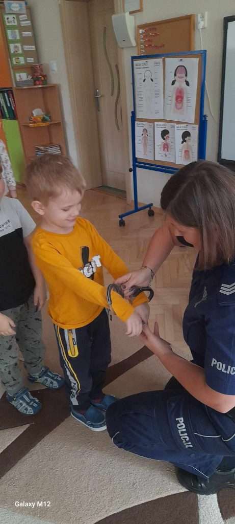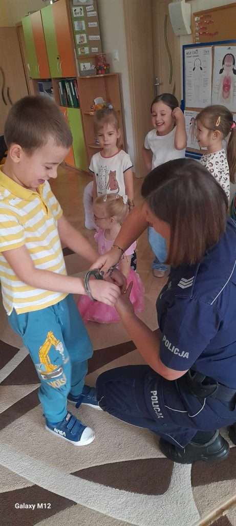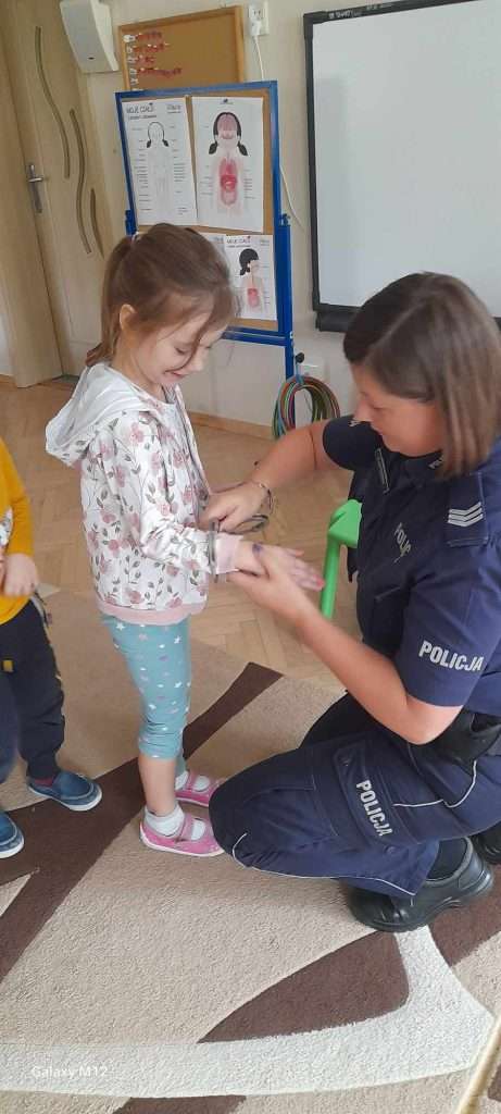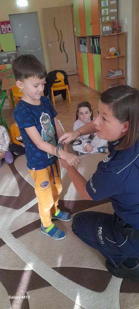 28 października w ramach realizacji programu własnego przedszkola pt. „Przedszkolak Ratownikiem” uczestniczyliśmy w spotkaniu z Policjantka i Strażakami. Pani Policjantka opowiedziała dzieciom na czym polega jej praca i w czym może nam pomóc. Przeczytała nam książkę pt. „Kicia kocia zostaję policjantka” – przypominając zasady przechodzenia przez ulicę i bezpieczeństwa na drodze, „Kicia Kocia na rowerze” – sprawdzając wiedzę dzieci na temat wyposażenia roweru w elementy odblaskowe i obowiązku zakładania kasku. Nie obyło się również bez zakładania kajdanek dzielnym ochotnikom ![]()