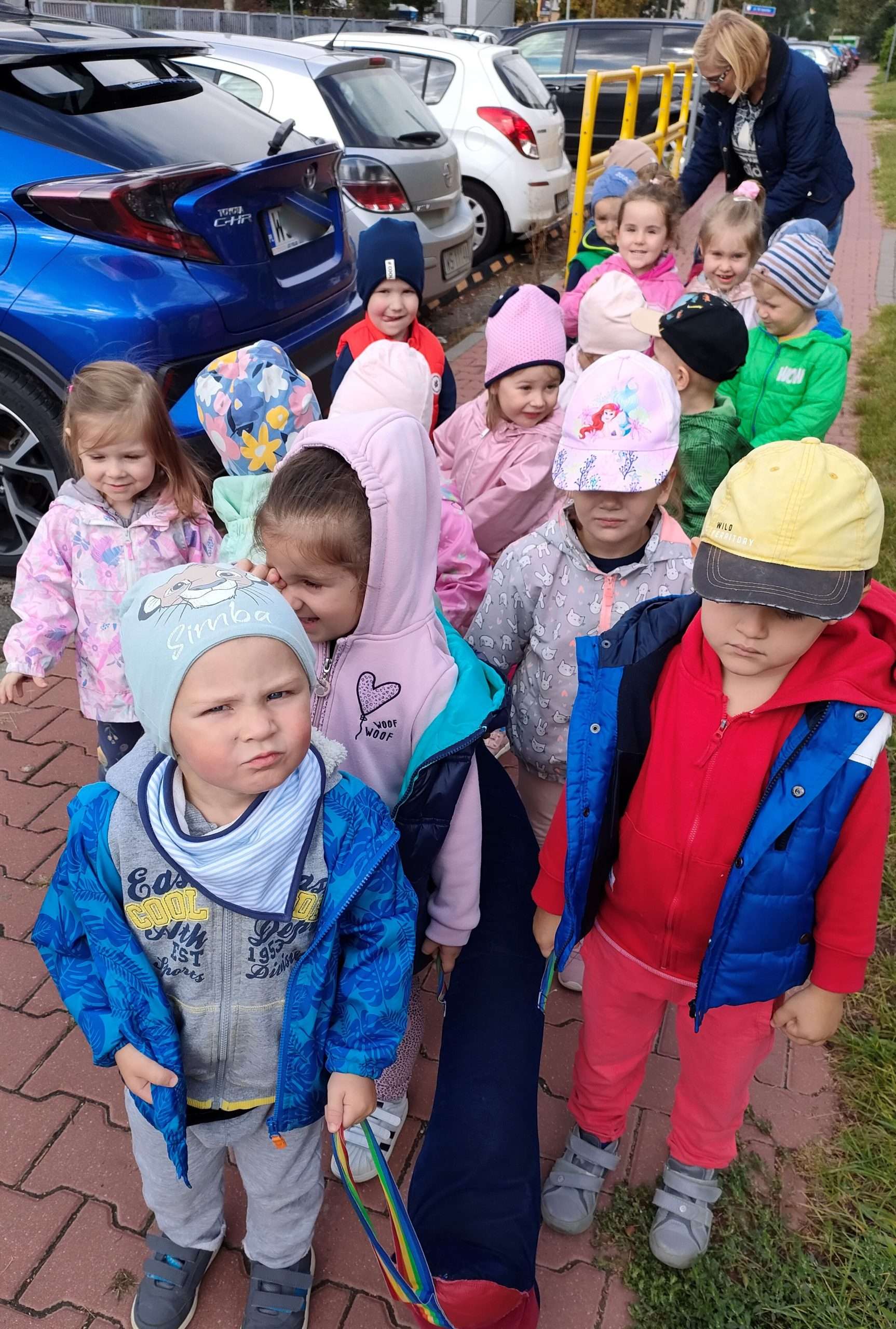 Dzieci 3-letnie z grupy „Czarodziejów” korzystając z ładnej pogody udały się z „kolorowym wężusiem” na pierwszy spacerek w pobliżu przedszkola. Dzieci były zadowolone i podekscytowane, a po powrocie do przedszkola wspominały ten pierwszy wyjątkowy spacer.