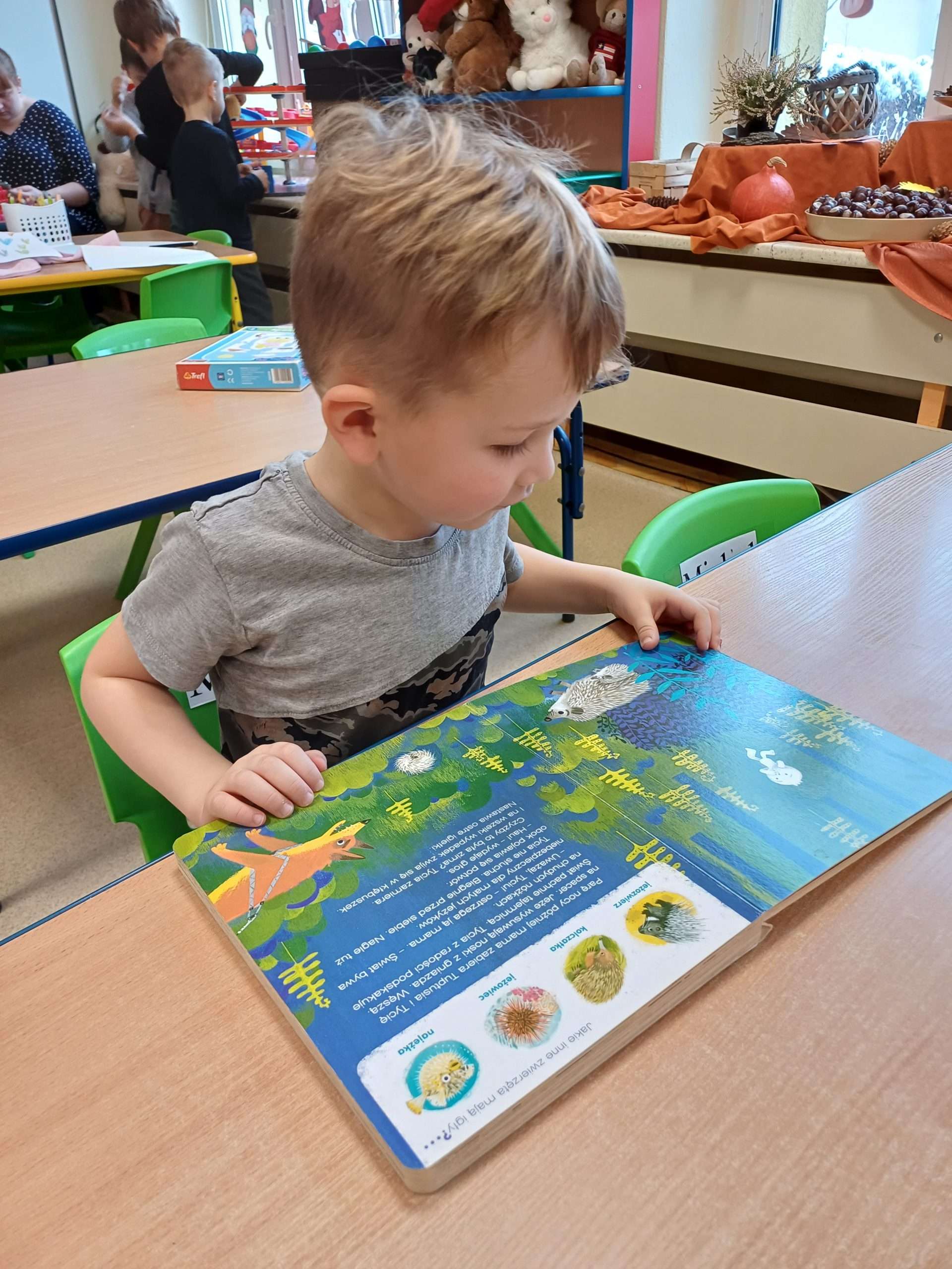 Nasz kącik przyrodniczy jest bardzo bogaty w przeróżne dar jesieni, z co bardzo wszystkim dzieciom i rodzicom bardzo dziękujemy. Nie służą nam one jednak tylko do dekoracji, ale również do różnych zabaw: edukacyjnych, plastycznych, muzyczno-rytmicznych. Korzystamy z listków, szyszek, kasztanów oraz żołędzi.