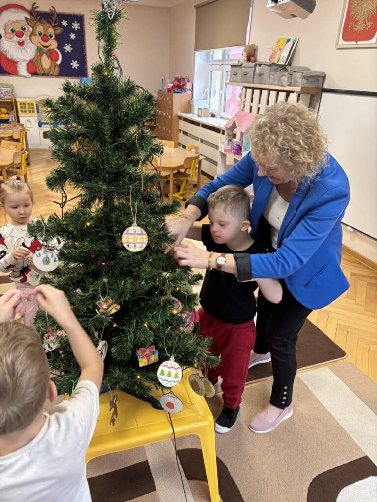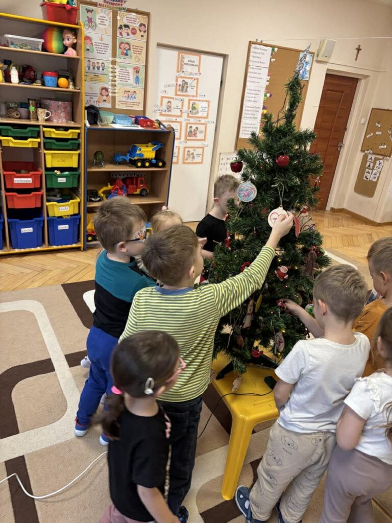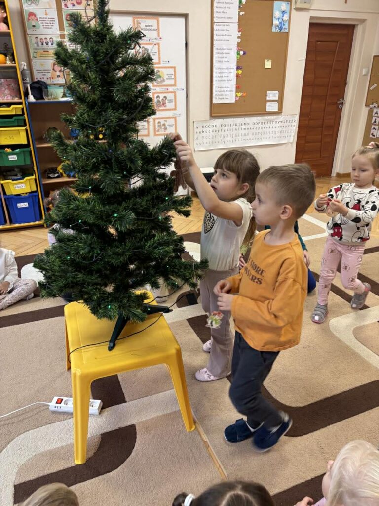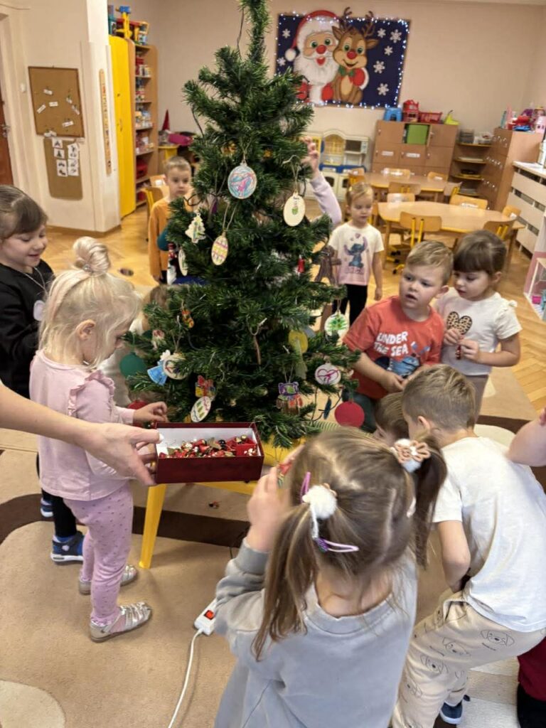 4 grudnia w grupie Puchatki odbyło się wspólne ubieranie choinki, które wprowadziło dzieci w radosny, świąteczny nastrój. Przedszkolaki z wielkim zaangażowaniem dekorowały drzewko, zawieszając własnoręcznie wykonane ozdoby. Choinkę przyozdobiły między innymi drewniane bombki, które dzieci samodzielnie ozdabiały podczas zajęć plastycznych, a następnie z dumą zawieszały na choince. Wspólne dekorowanie było okazją do rozwijania kreatywności, współpracy oraz budowania świątecznej atmosfery w naszej grupie.