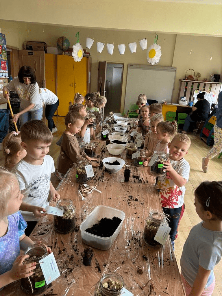 Dnia 22 maja 2025r.odbyły się warsztaty dla dzieci „Ogród w szkle”. Dzieci z grupy „Puchatki” miały okazję stworzyć swój własny, miniaturowy ekosystem jako prezent dla Rodziców z okazji Ich święta. Przedszkolaki, z pomocą Pań z grupy a także samodzielnie układały warstwy podłoża i sadziły rośliny w szklanych naczyniach, poznając przy tym zasady funkcjonowania zamkniętego obiegu w przyrodzie.