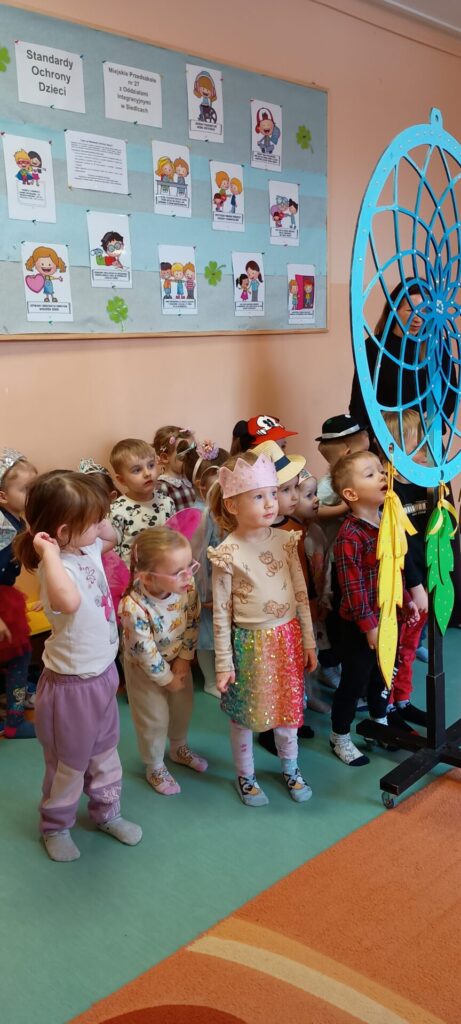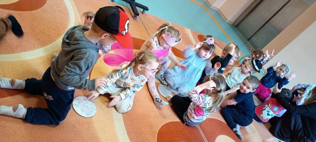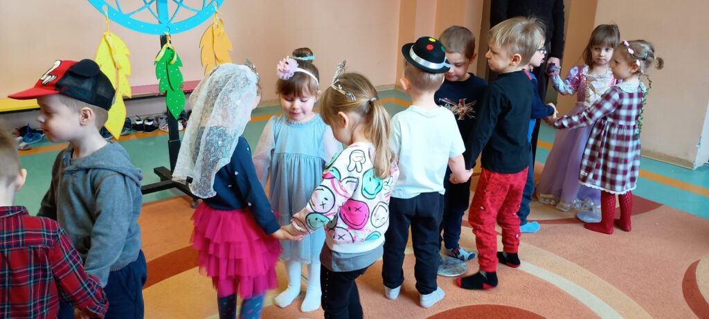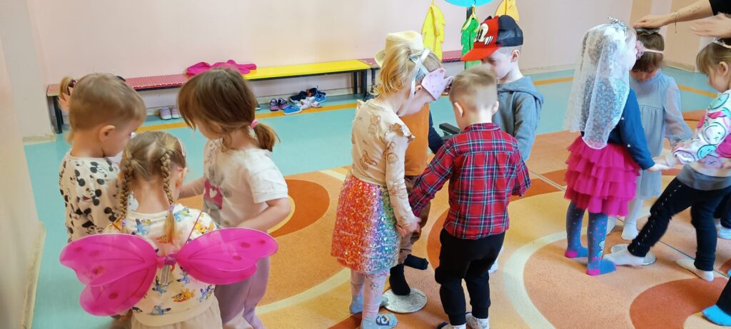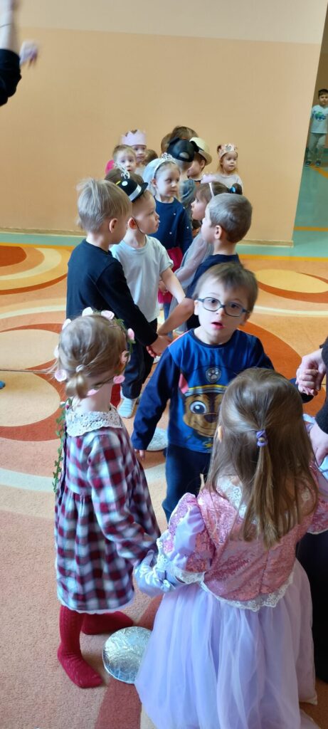 Dzieci przyszły na zajęcia z elementami strojów karnawałowych, dzięki czemu było bardzo kolorowo, radośnie i tanecznie. 🥳👑🎩