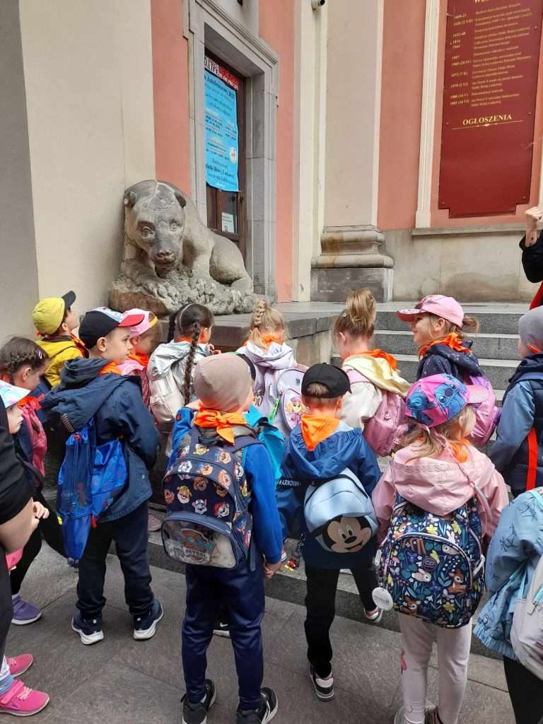 Przy pomniku warszawskiej Syrenki wysłuchaliśmy opowieści o jej odwadze i sile, a potem zobaczyliśmy Barbakan oraz niezwykłego Śpiącego Niedźwiedzia. Dzieci z zaciekawieniem dotykały starego dzwonu spełniającego życzenia – trzeba tylko dokładnie okrążyć go dookoła!